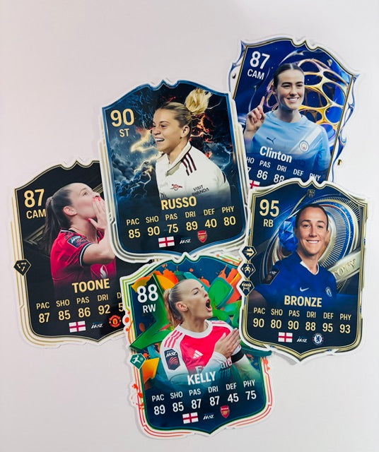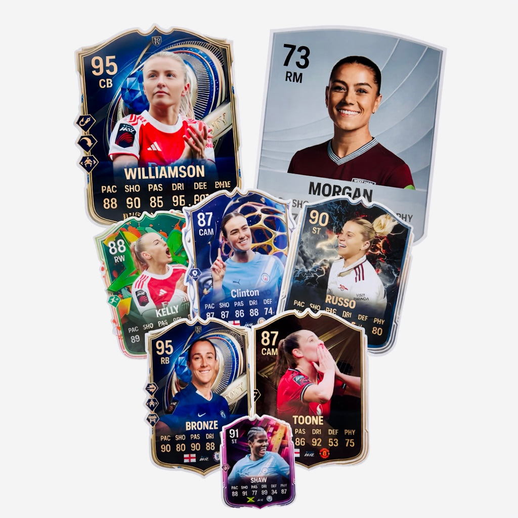 Upgrade your collection with these unique Player Shields, designed to showcase your favourite football stars in a bold, modern display format. Each shield features a striking player portrait, position, overall rating, and detailed stat layout, printed on premium card stock and finished with a durable laminate for long‑lasting quality.